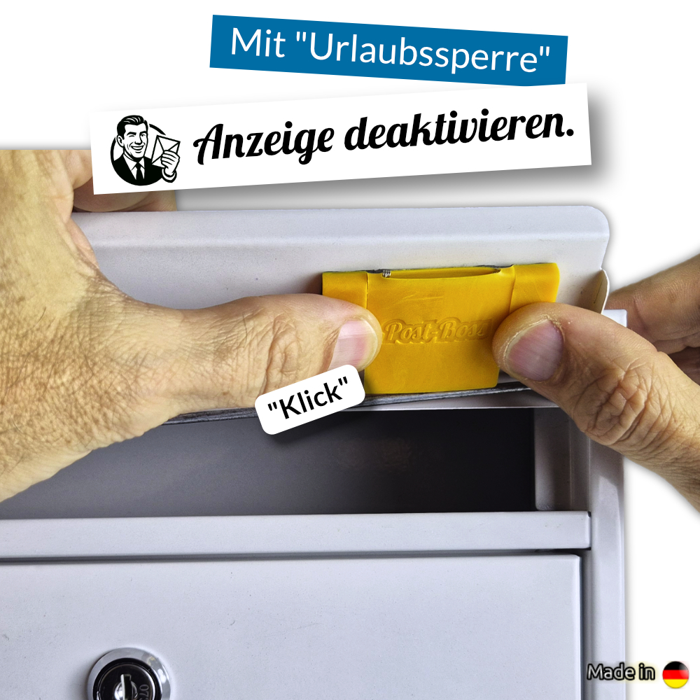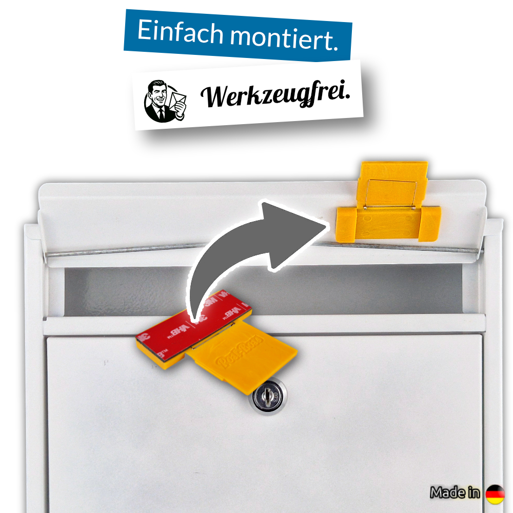 Nach dem Entnehmen der Post schiebst Du die Anzeige mit einem Finger in Deinen Briefkasten. Bereit für den nächsten Einwurf.