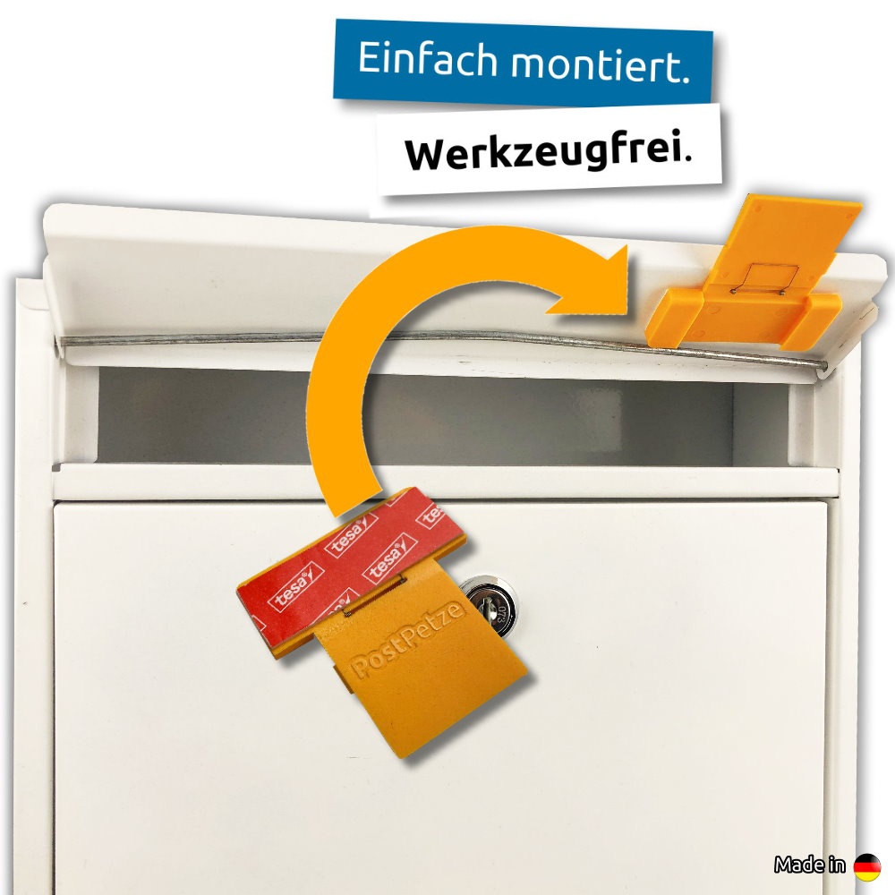 Passend für alle Standardbriefkästen mit Deckel oder Frontklappe (nach vorne öffnend). Schnelle werkzeugfreie Integration in Deinen Postkasten. Rückstandsfreie Demontage.
